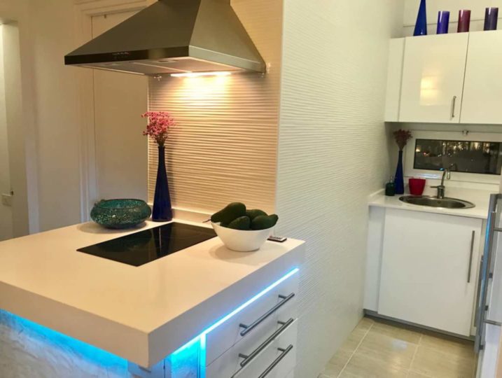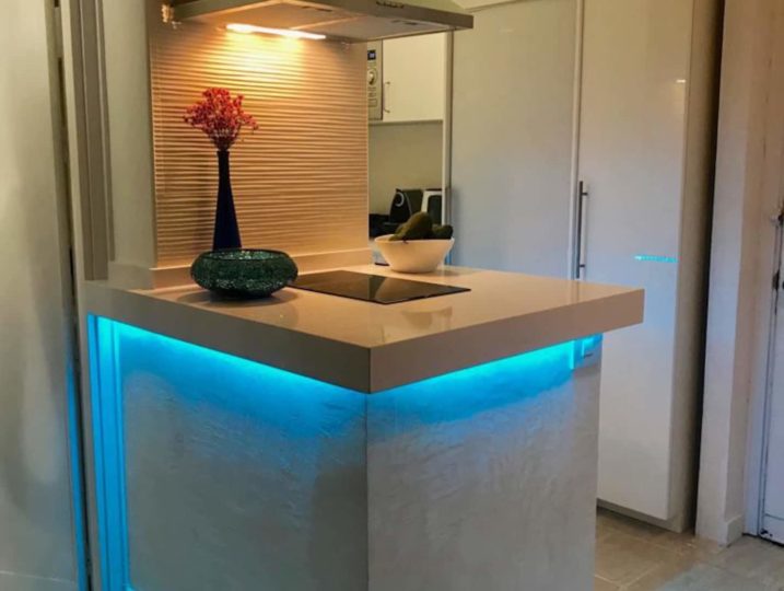 Well equipped kitchen open to the living room with sea view.