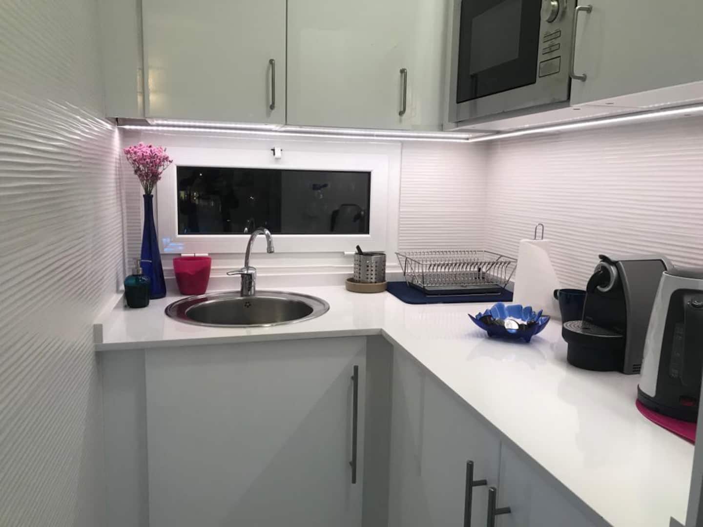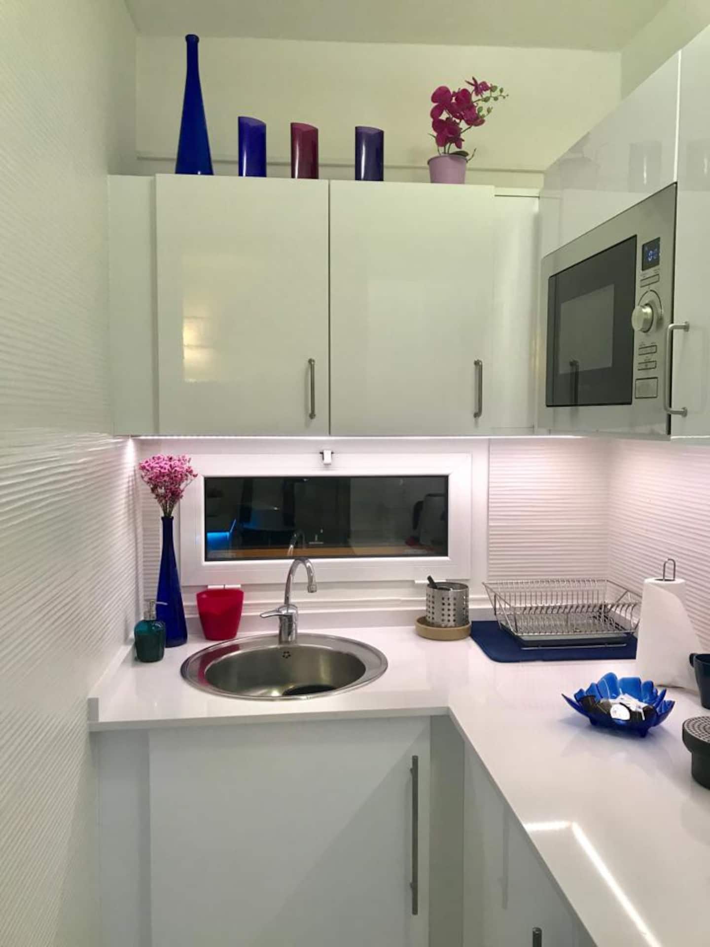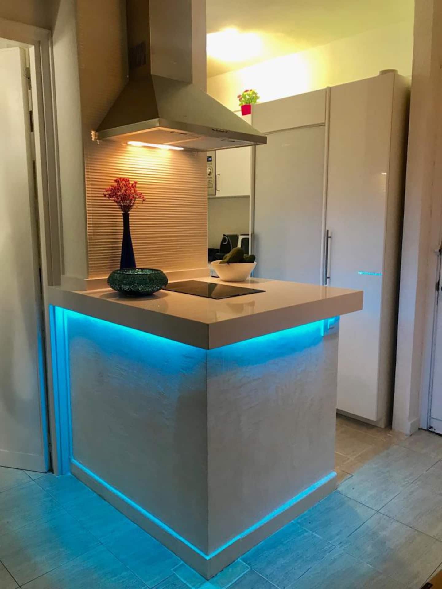 Well equipped kitchen open to the living room with sea view.